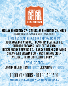 Craft beer, cider, and cocktail vendors on hand will include Aquanova Brewing Co., Black Fly Beverages, Clifford Brewing Co., Collective Arts Brewing, Nickel Brook Brewing Co., Sassy Britches Brewing Co., Shawn & Ed Brewing Co., West Avenue Cider House, and Willibald Farm Distillery & Brewery.