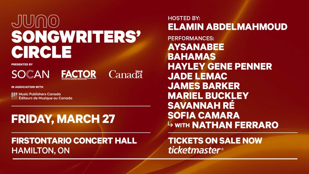 Curious about the stories and meanings behind your favourite songs? Known by critics and fans as “the jewel of the JUNOS,” this intimate event transcends beyond the studio, offering candid conversations and acoustic performances that create memorable connections between artists and audiences. The JUNO Songwriters’ Circle promises a once-in-a-lifetime experience that will leave you floored by unforgettable performances from this year’s JUNO-nominated artists, including Aysanabee, Bahamas, Hayley Gene Penner, James Barker, Savannah Ré, Sofia Camara with Nathan Ferraro, and more!