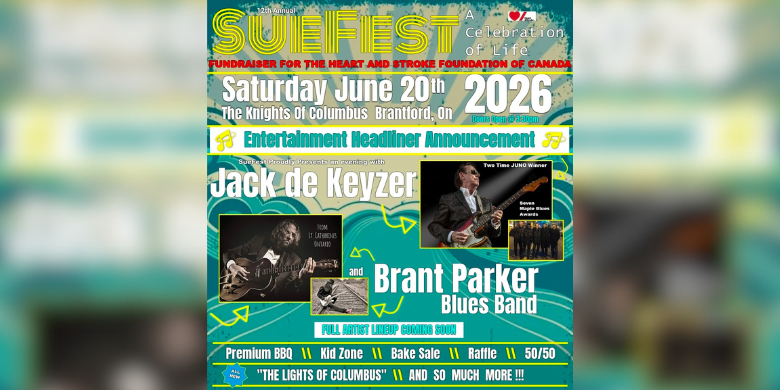 Featuring a stellar line-up of musicians, including Jack de Keyzer and the Brant Parker Blues Band and more! Fantastic raffle table, bake sale, affordably-priced barbecue style meal, kid zone, “The Lights of Columbus”, and more festivities!