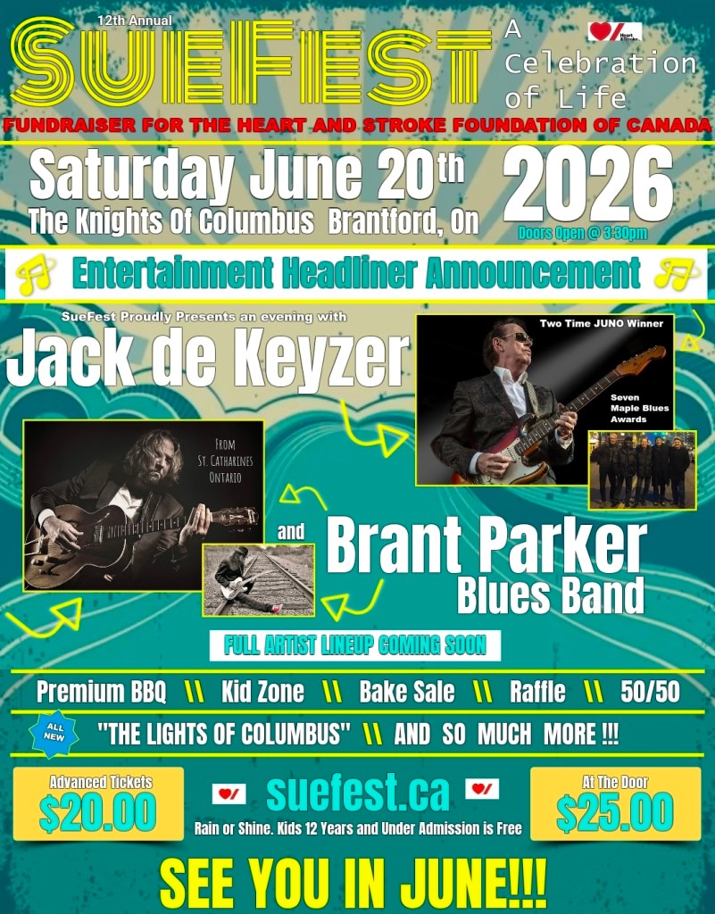 Proceeds to the Heart and Stroke Foundation of Canada – SueFest has helped to raise $35,000.00+ and counting. Your support just may save a life!